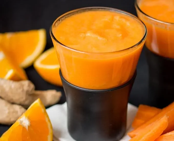- Add the juice of 1 large orange, the ginger, chopped carrot, lemon juice, honey, 50ml cold water, and a splash of the hot water to your smoothie maker or blender (see warning above about using hot liquids in smoothie makers and blenders).Juice of 1 large orange, 1 tsp grated fresh ginger, 1 large carrot, juice of 1/2 a lemon, 1 tbsp honey, 50 ml (3 tbsp + 1 tsp) cold water