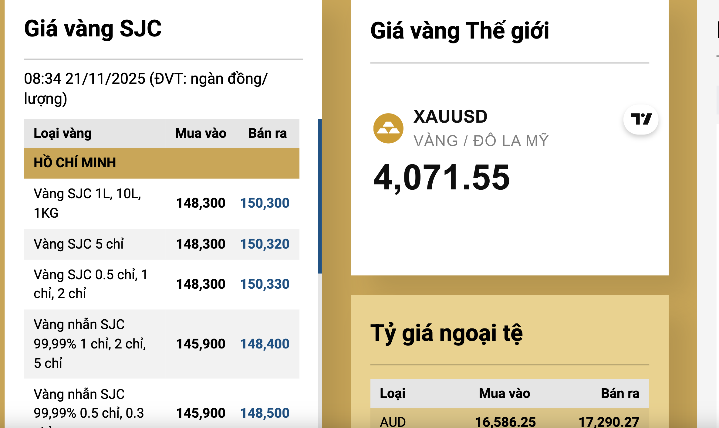 Sáng 21-11, Công ty vàng bạc đá quý Sài Gòn (SJC) niêm yết giá vàng miếng SJC mua vào 148,3 triệu đồng/lượng, bán ra 150,3 triệu đồng/lượng bán ra, giảm 700.000 mỗi lượng so với sáng hôm qua.